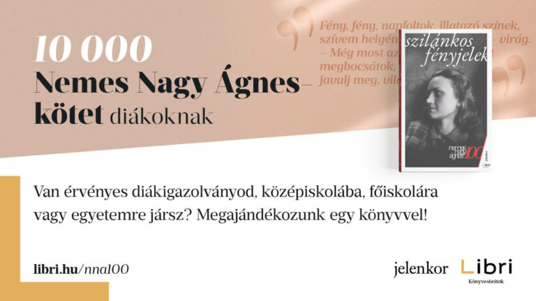 Nemes Nagy Ágnes centenáriuma a Libri és a Jelenkor Kiadó közös munkájából megszületett a Szilánkos fényjelek című Nemes Nagy Ágnes-kötet, amit ingyen bocsátottunk közép- és felsőfokú tanulmányaikat végző diákok rendelkezésére.